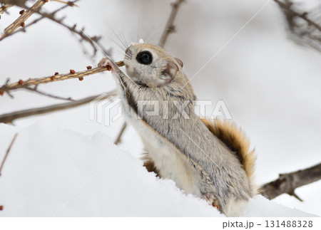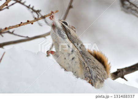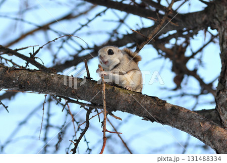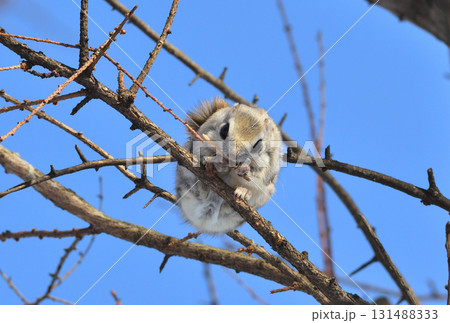 北海道の公園で日中に小枝を食べるエゾモモンガ