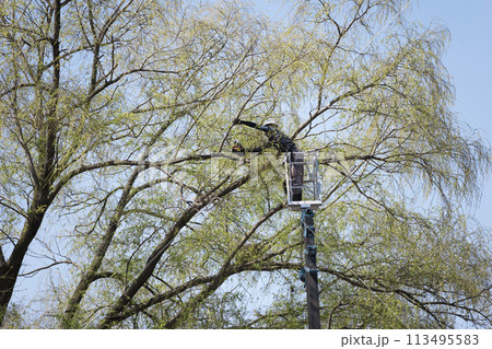 高い木の枝をクレーンを使って剪定作業する作業員男性
