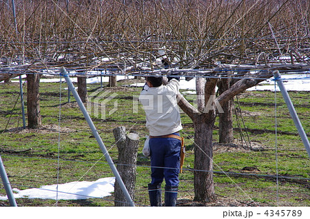 梨畑と農夫 梨の枝の剪定作業 早春の梨畑