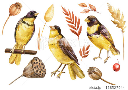 Yellow bird, Leaves, seeds poppy, lotus and seasonal botanicals. Watercolor autumn nature set on isolated, fall clipart