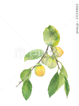 水彩で描いた枝葉付き柿の実【手描き】白バック 透過背景 コピースペースあり