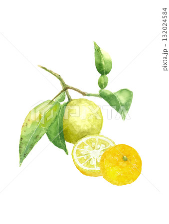 水彩で描いた枝葉付き柚子のイラスト【手描き】白バック 透過背景 コピースペースあり