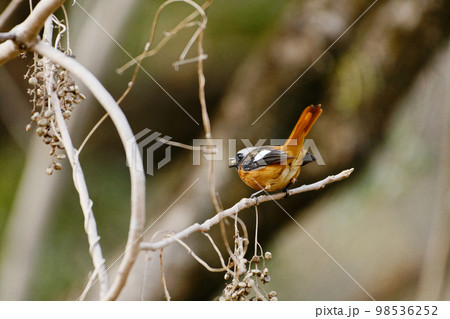 可愛い小鳥の冬鳥ジョウビタキのオスが青空をバックに桜の木の枝に止まる