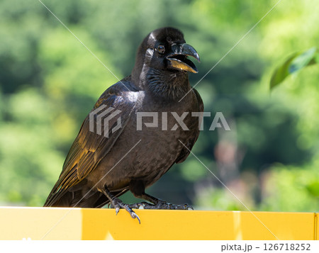 公園の木の枝に止まって羽を休めるハシブトガラス
