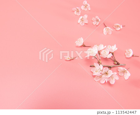 Branch of blooming cherry blossoms isolated on pink background. Traditional japanese flower.