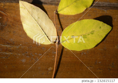 枝先に緑の葉と不思議な実のシマタニワタリノキの木の枝のアップの風景