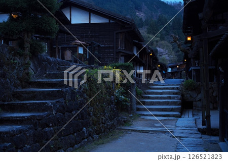 暮れなずみ灯りともる妻籠宿の古い町並みと枡形
