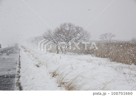 雪景色。台中の湖の土手の枯草に雪