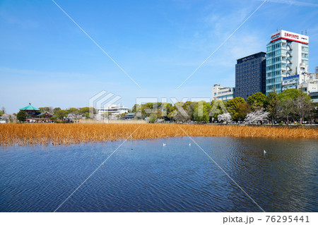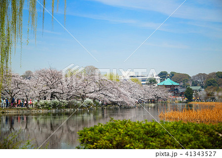 サクラ満開の上野の不忍池と蓮池 柳