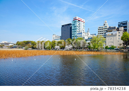 サクラ満開の上野の不忍池と周囲のビル群