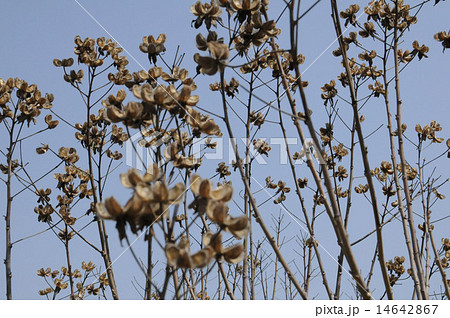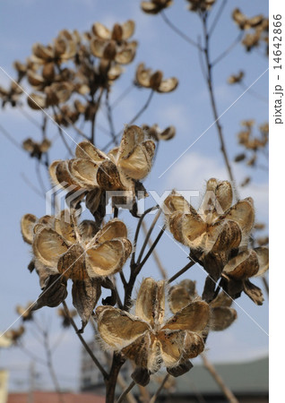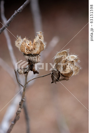冬に裂開して種子がついたアオイ科の花枯芙蓉