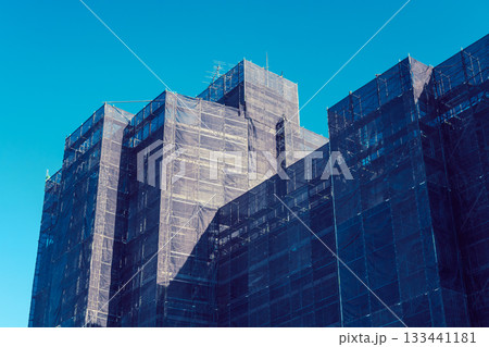 青空と仮設足場 ビル修繕工事
