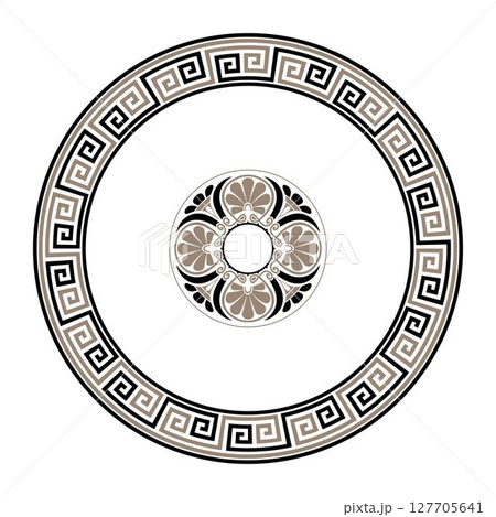 Greek round frame in golden black colors with a pattern in the center of the plate. Greek key, meander pattern. Patterns of Ancient Greece, ancient Rome Empire. Typical egyptian, assyrian, greek motiv