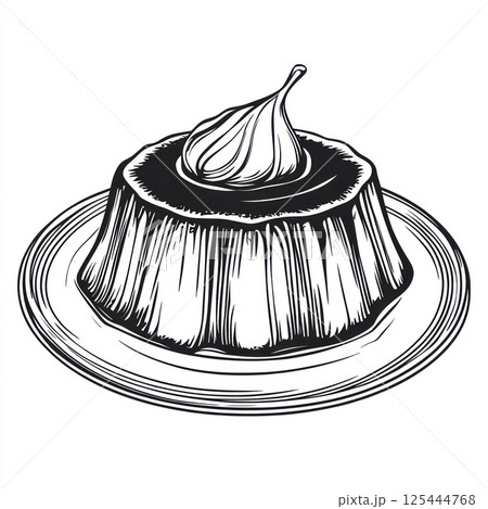 Hand-drawn illustration of a creamy dessert with a garlic clove topping, served on a plate.