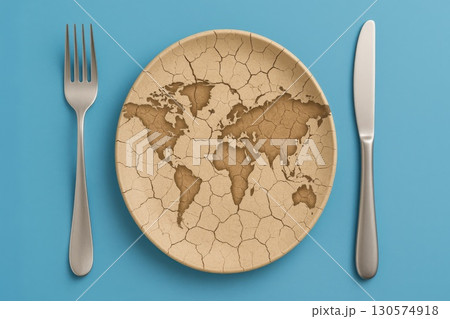 Global Food Crisis Awareness Earth Map Carved Plate on Dinner Table Blue Backdrop Conceptual Art