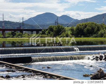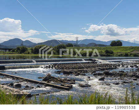 大和川に設置された柏原堰堤の夏景色