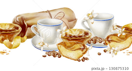 Seamless border Portuguese traditional breakfast:сup,coffee beans with halved and whole pasteis de nata tart with creamy custard,lemon flowers.Watercolor illustration pastel de nata in realistic style