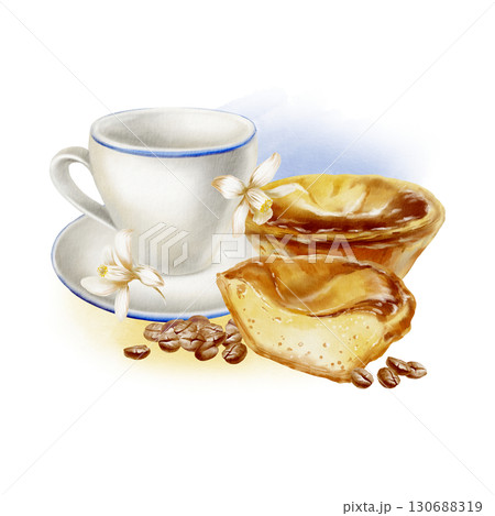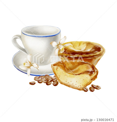 Portuguese traditional breakfast: сup,coffee beans with halved and whole pasteis de nata tart with textured creamy custard,lemon flowers.Isolated hand drawn watercolor illustration in realistic style