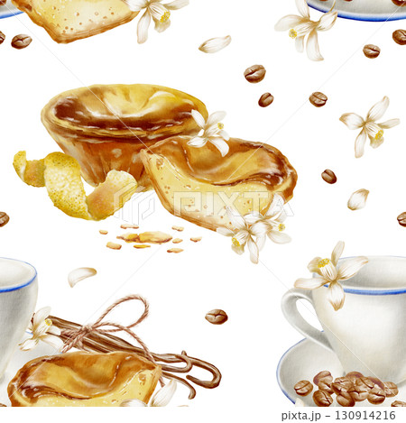 Seamless pattern Portuguese traditional breakfast:сup,coffee beans,halved and whole pasteis de nata tart with creamy custard,lemon flowers.Watercolor illustration pastel de nata for bakery branding