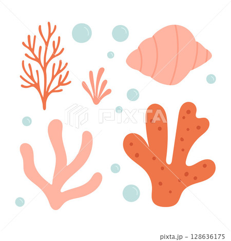 Flat coral reef elements with organic seaweed and shell shapes create a soft pastel marine composition for ocean-themed prints, stickers, and decor