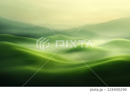 霧に包まれた幻想的な緑の丘陵風景