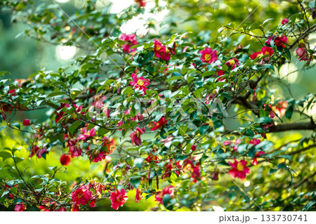青空に合う春のフラリエの鮮やかなツバキ