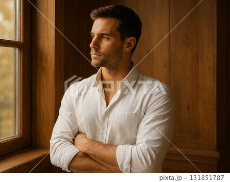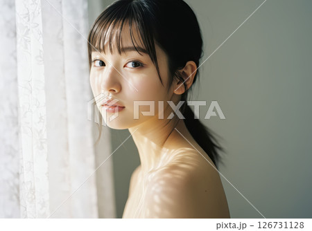 朝の光に包まれて静けさと美しさを纏う若い女性のポートレート(AI生成画像)