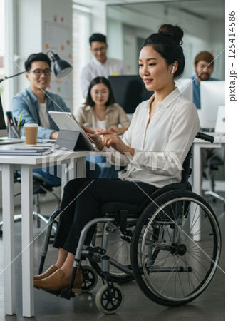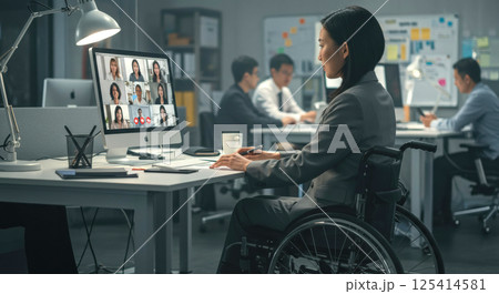 車椅子でビデオ会議をリードする日本人女性(ai生成画像)