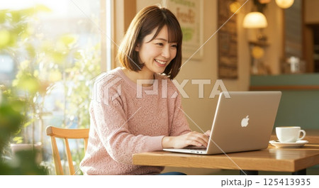カフェで笑顔のアジア系フリーランサー(ai生成画像)