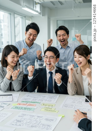 笑顔でプロジェクトを確認する日本人チーム(ai生成画像)