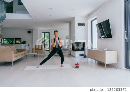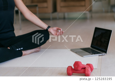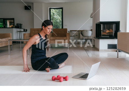 Young Beautiful Female Exercising, Stretching and Practising Yoga with Trainer via Video Call Conference in Bright Sunny House. Healthy Lifestyle, Wellbeing and Mindfulness Concept