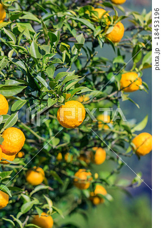 冬の果樹園にたわわに実った柚子