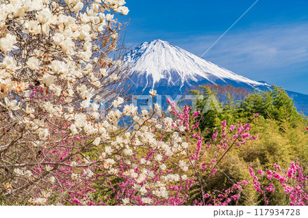 【静岡県】富士宮市柚野の春 白モクレンと紅梅 富士山