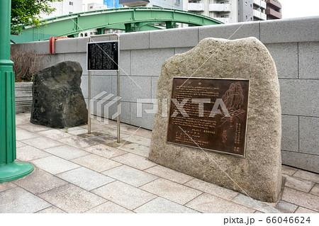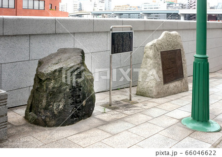 神田川に架かる柳橋の「復興記念」の石碑(東京都中央区)