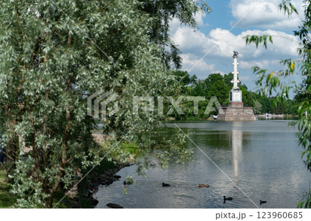 A willow leans over the Big Pond of the Catherine Park. The Chesme Column rises