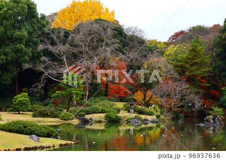 六義園のつつじ茶屋から臨む山陰橋の紅葉の秋風景