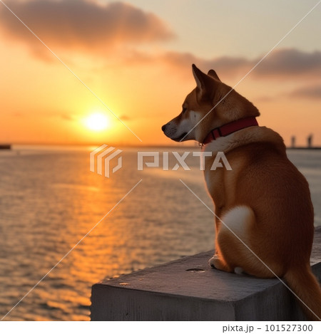 夕日に染まる海にたたずむ柴犬(あかしば)