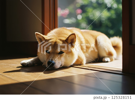 縁側で日向ぼっこする柴犬のリラックスショット(AI生成画像)