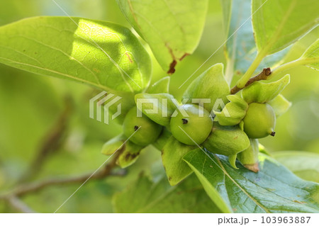自然 植物 カキノキ、六月。花が終わって青い小さな実が育ち始めました