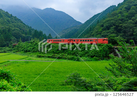 栃原橋梁を渡り終えたオレンジ色の播但線の気動車