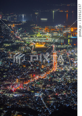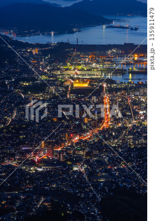 日本 広島県呉市栃原町にある灰ヶ峰の展望台から望む呉の市街地の夜景と瀬戸内海
