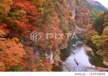 日光市 鬼怒川温泉 鬼怒盾岩大吊橋から見た鬼怒川の紅葉とライン下り