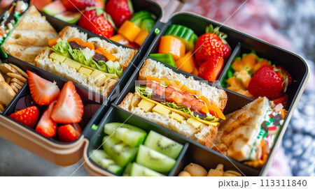新鮮な果物と野菜、カラフルでバランスの取れた食事が入ったヘルシーなお弁当