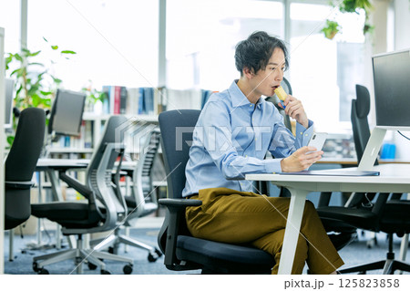 オフィスでプロテインバーを食べる男性