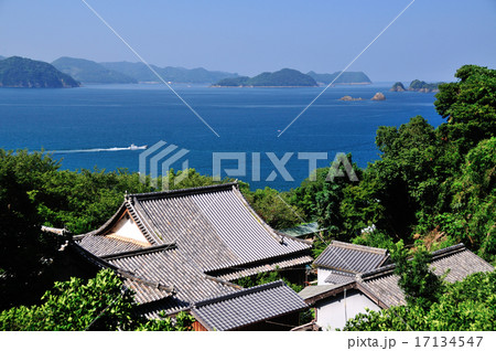 栖原の海に浮かぶ島々(毛無島・苅藻島・鷹島)と施無畏寺