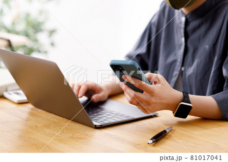 オフィスでスホを見るビジネスウーマン 撮影協力:スカパー東京メディアセンター