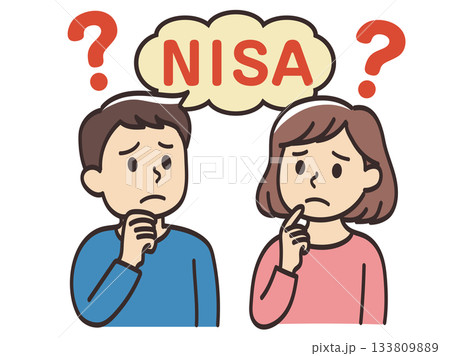 NISAを始めたいがよく分からなくて困り顔の若い男女のイラスト