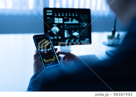 マルチモニターのチャートを見つめる若いビジネスパーソン トレーダー 投資家 イメージ