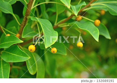 自然 植物 エノキ、夏の果実。緑色の葉の間にオレンジ色や黄色の小さな果実がたくさん