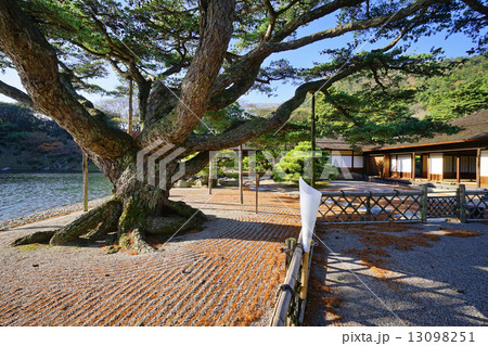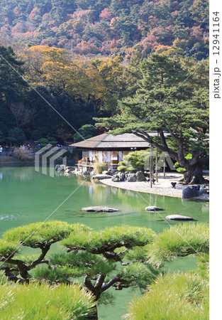 特別名勝「栗林公園」掬月亭の初莚観の縁側から眺める秋の南庭南湖